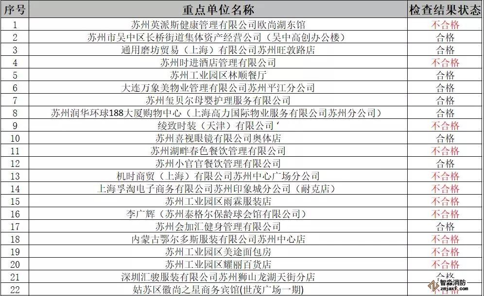根據《中華人民共和國消防法》和應急管理部消防救援局《關于全面推行“雙隨機、一公開”消防監管工作的通知》的規定,蘇州市消防救援支隊決定對11月份抽查結果進行公示,請相關單位認真遵守消防法律法規,落實消防安全主體責任。